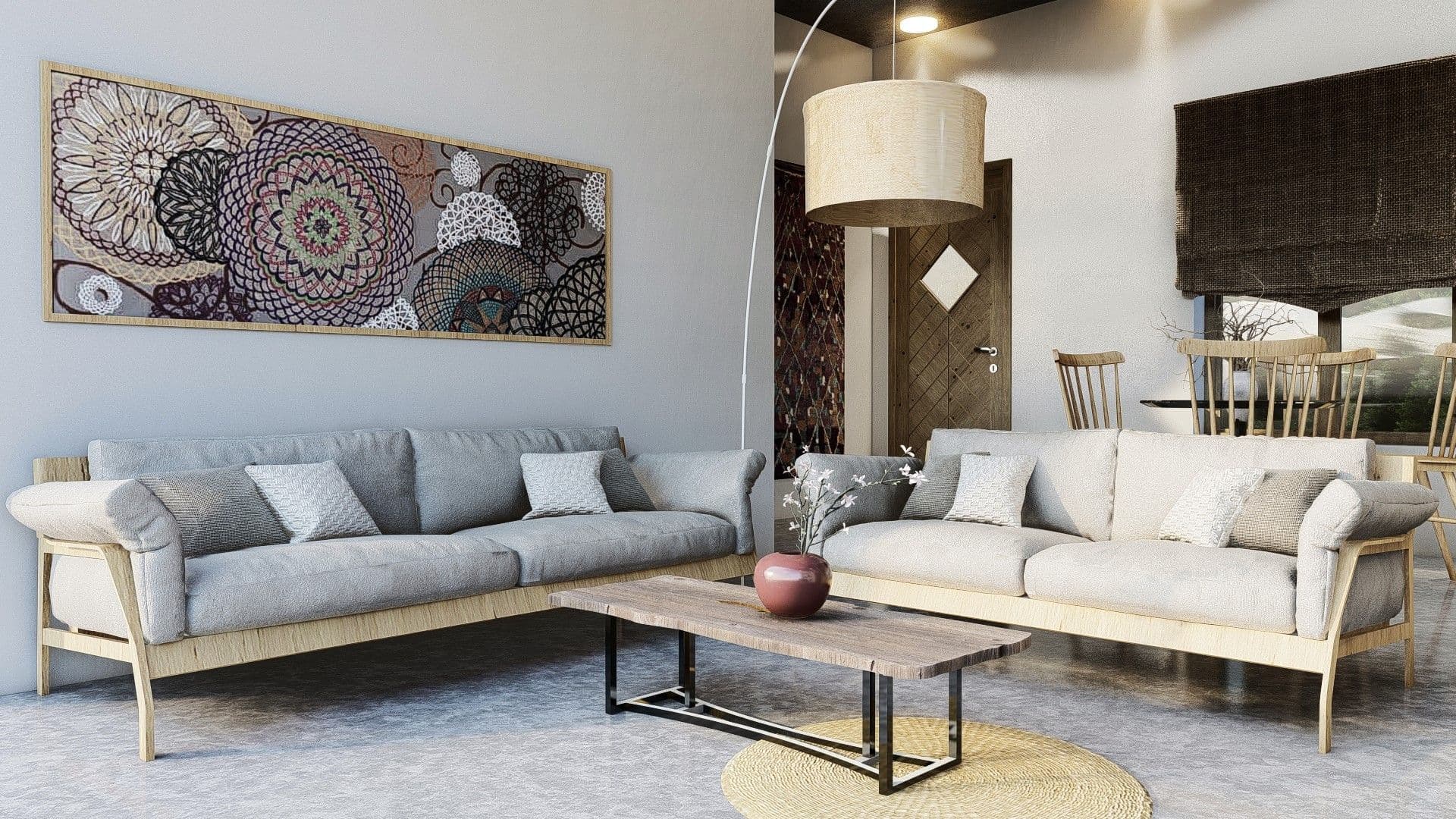 Cette maison au design bohème enchante par son espace ouvert et lumineux, où les nuances de gris doux et de beige créent une ambiance apaisante. Le salon se distingue par ses canapés confortables aux lignes épurées et aux structures en bois clair, harmonieusement complétés par une table basse en bois brut et métal. Le tableau mural aux motifs complexes ajoute une touche artistique subtile. La chambre respire la sérénité avec son lit drapé de textiles naturels et ses luminaires suspendus en osier, accentués par des éléments décoratifs rustiques. La terrasse, enveloppée de verdure luxuriante, invite à la détente avec ses meubles en bois massif et ses tons terreux, offrant une continuité visuelle et sensorielle avec l'intérieur