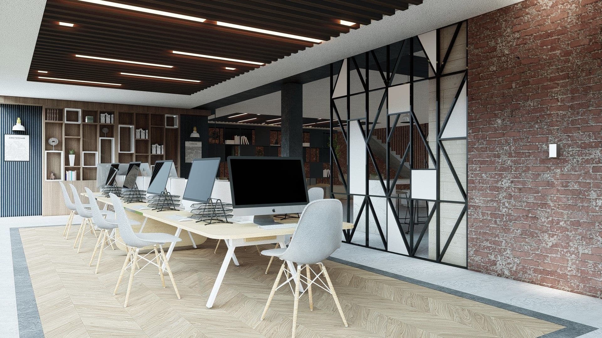 Ce Workspace, baigné de lumière naturelle et habillé de murs en briques apparentes, offre une juxtaposition audacieuse entre l'ancien et le contemporain. Les vastes fenêtres, avec leurs structures métalliques géométriques, laissent entrer un flot de lumière, illuminant les postes de travail minimalistes équipés de Mac modernes. Les chaises ergonomiques aux tons gris pâles s’harmonisent subtilement avec les bureaux en bois clair, créant un contraste apaisant avec la rugosité des murs en briques. Des touches de verdure apportées par des fauteuils verts élégants dans les coins de détente invitent à la relaxation et à la réflexion. Au-dessus, un majestueux luminaire en forme de constellation répand une douce lumière, insufflant une atmosphère chaleureuse et inspirante. Les œuvres d'art noir et blanc aux lignes épurées accrochées aux murs ajoutent une touche de sophistication, encourageant une ambiance de productivité et de créativité. Cet espace de travail transcende le banal pour devenir un sanctuaire où chaque détail est conçu pour inspirer et motiver.