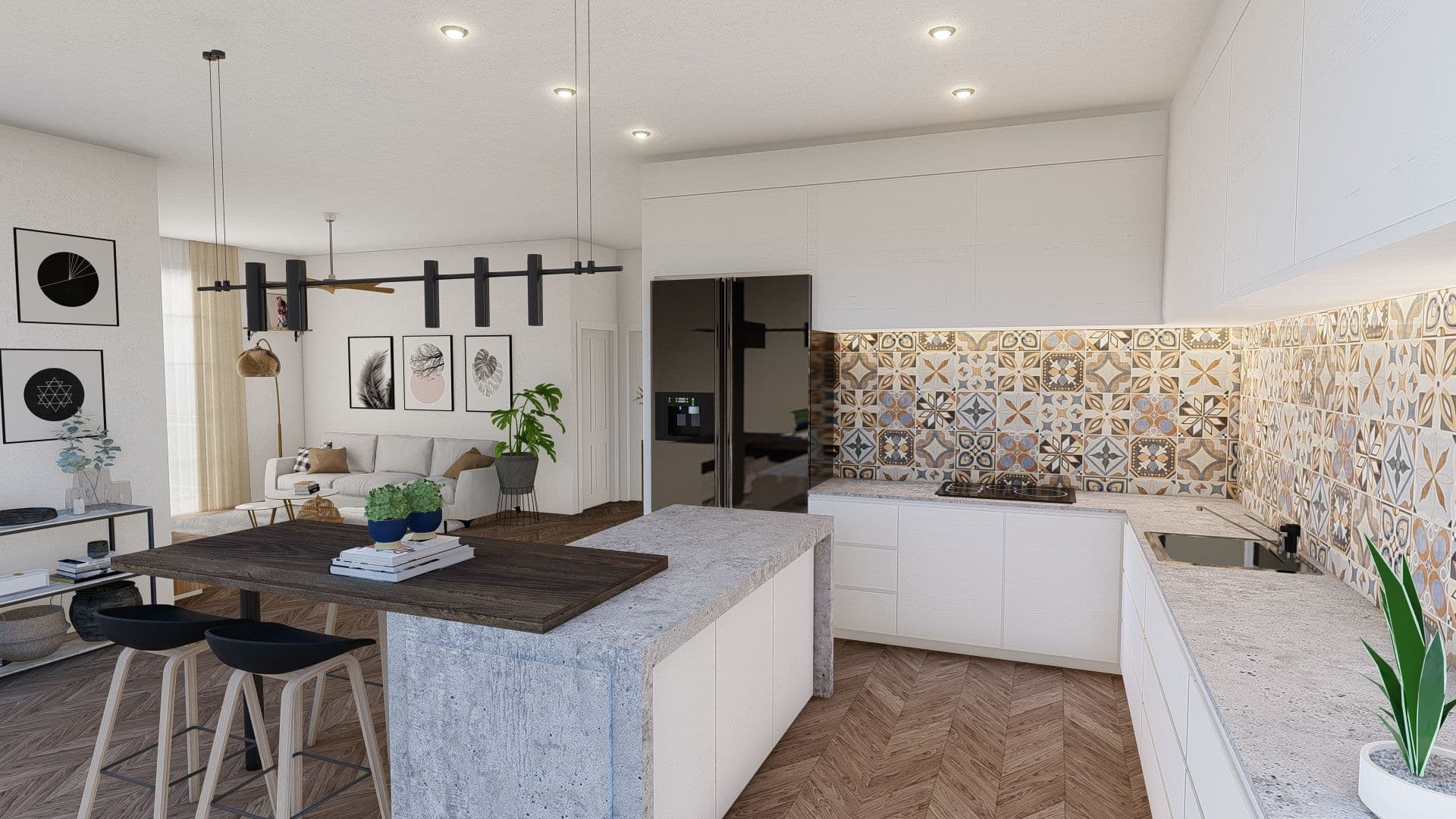 Dans un espace où le passé rencontre le présent, cet appartement boho-chic s'ouvre comme un havre de paix et de créativité. Le sol en bois à chevrons guide le regard vers une cuisine où les carreaux de céramique ornés de motifs géométriques et floraux racontent des histoires d'antan, tout en dialoguant avec les lignes épurées des armoires blanches modernes. Un îlot central en béton, aux surfaces brutes et raffinées, sert de point de convergence pour l'inspiration, tandis que les tabourets en bois et métal invitent à s'y installer pour réfléchir ou discuter. Dans le salon attenant, des œuvres d'art monochromatiques et des plantes verdoyantes insufflent une énergie apaisante et vivifiante, créant une atmosphère propice à la réflexion profonde. La lumière naturelle inonde l'espace, soulignant la fusion harmonieuse entre fonctionnalité et esthétique. C'est un lieu où chaque détail, chaque couleur, chaque forme s'unit pour créer un environnement stimulant, parfait pour travailler et s'épanouir.