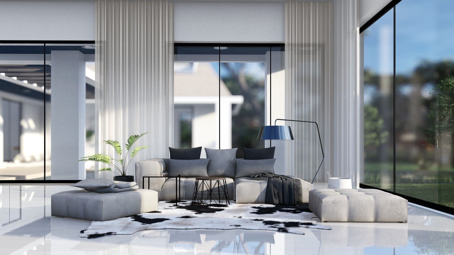 En pénétrant dans cette villa contemporaine, on est aussitôt frappé par l'élégance subtile et la quiétude qu'elle inspire. Les immenses baies vitrées laissent entrer une lumière naturelle abondante, inondant l'espace d'une clarté sereine. Le design épuré et les formes géométriques du mobilier, dominées par des tons gris apaisants, sont rehaussés par quelques touches de noir et de blanc, créant un contraste raffiné et dynamique. Le tapis à motifs de peau de vache ajoute une texture riche et invite à la détente. Les plantes vertes, disposées avec soin, apportent une touche de fraîcheur et de vie, équilibrant la modernité minimaliste de l'ensemble. Cet espace, à la fois ouvert et intime, offre un cadre idéal pour le travail, où la concentration et la créativité peuvent s'épanouir dans une harmonie parfaite.