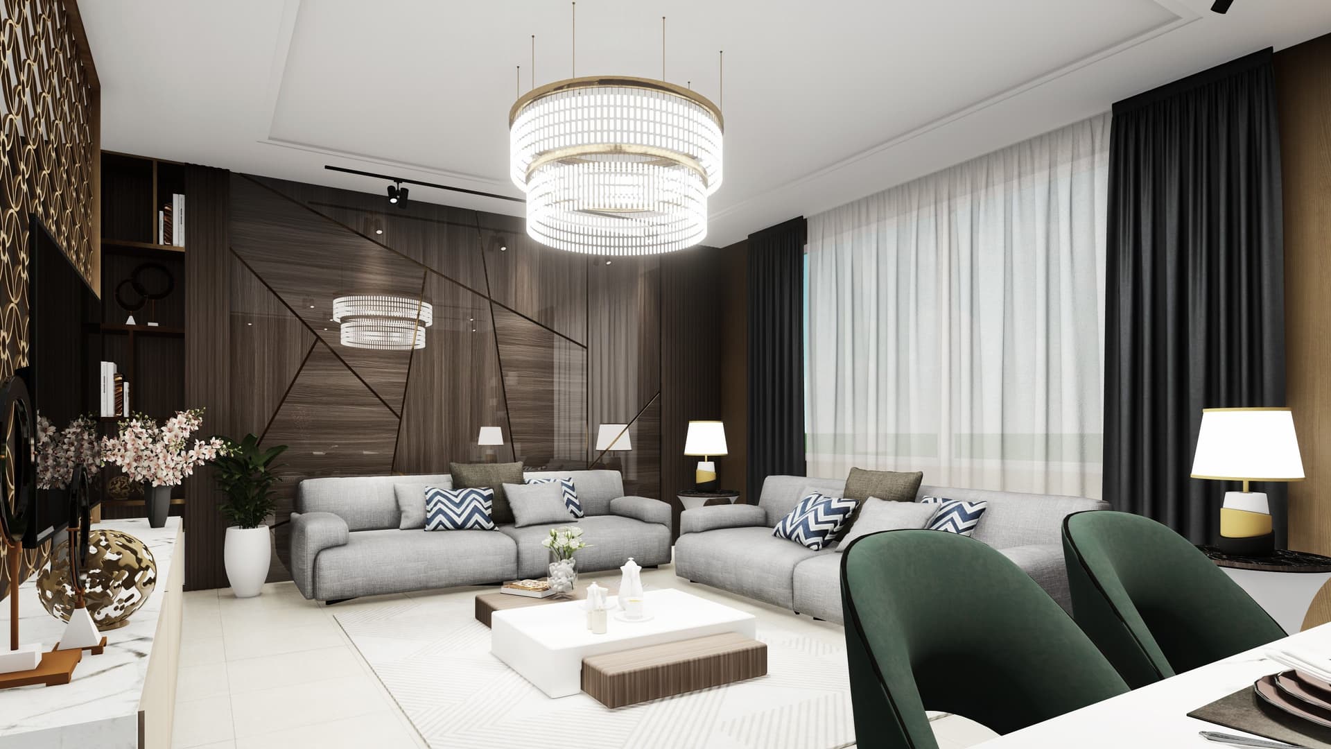 Dans cette maison marocaine, l'architecture se déploie avec une élégance contemporaine, créant un cadre de travail à la fois raffiné et apaisant. Les murs en bois sombre, striés de lignes géométriques subtiles, apportent une profondeur et une sophistication qui stimulent l'intellect. La lumière, diffusée par de majestueux lustres en cristal, enveloppe la pièce d'une clarté douce, propice à la concentration et à la créativité. Les canapés gris, aux formes généreuses et confortables, invitent à la détente entre deux sessions de travail intense, tandis que les touches de vert des fauteuils et des plantes apportent une note de fraîcheur et de vitalité. Le contraste entre les rideaux noirs et blancs, soigneusement drapés, ajoute une dimension théâtrale à l'ensemble, transformant cet espace en un véritable sanctuaire de l'inspiration. Chaque élément, du mobilier au choix des couleurs, est pensé pour créer une harmonie, favorisant une ambiance sereine.