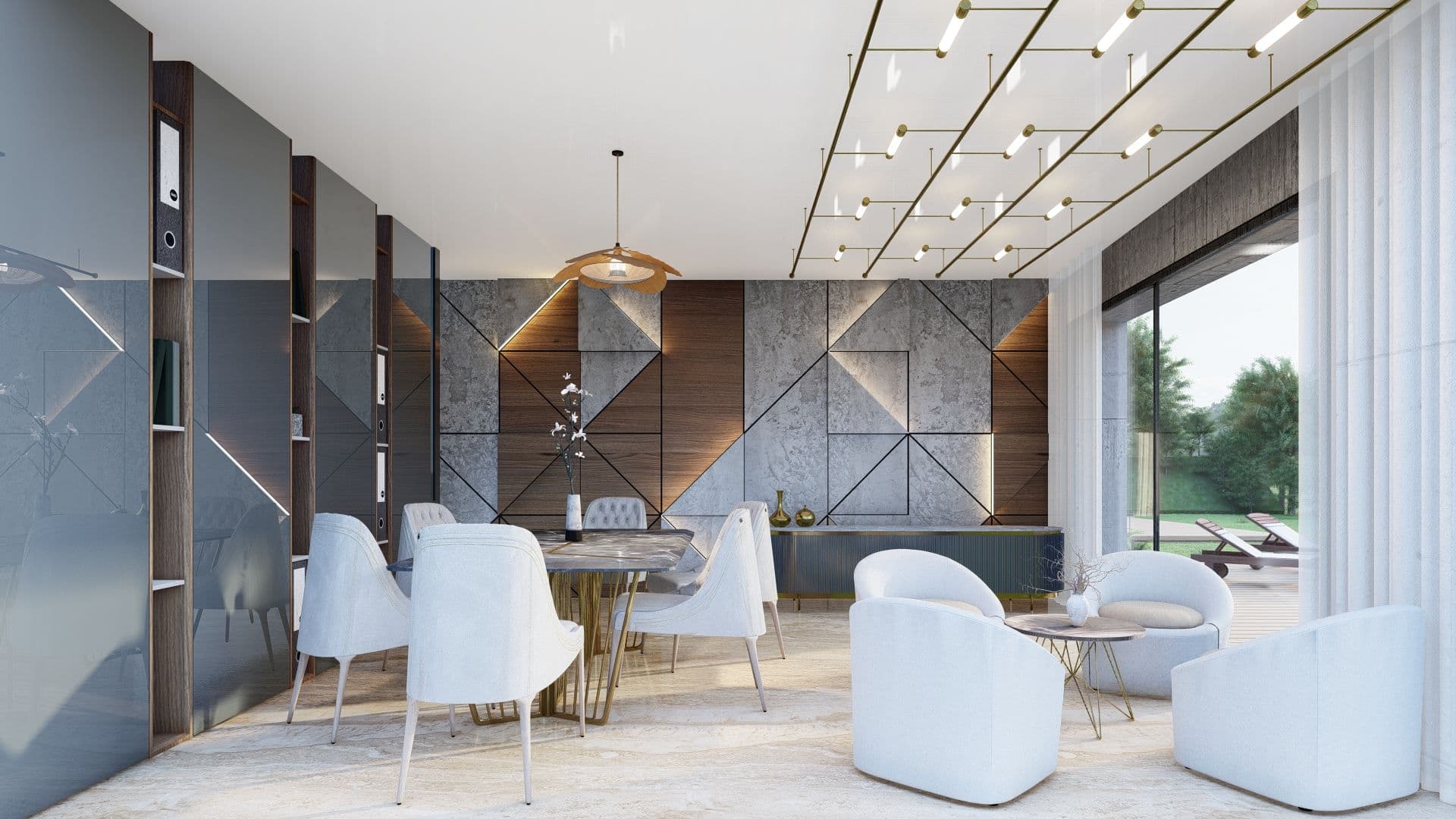 Dans cet espace, chaque détail est pensé pour créer un environnement vie inspirant. Dominée par des nuances de gris et de bois naturel, se marie harmonieusement avec les touches subtiles de blanc, apportant à la fois chaleur et modernité. Les formes géométriques des murs, avec leurs lignes nettes et leurs angles précis, ajoutent une dynamique visuelle qui stimule l'esprit. Les larges ouvertures vitrées laissent entrer une lumière naturelle abondante, créant une atmosphère sereine et propice à la concentration. Les meubles, aux lignes épurées et au design contemporain, offrent un confort discret sans compromettre l'élégance de l'ensemble. Cet espace, avec son équilibre parfait entre fonctionnalité et esthétisme, incarne l'idéal d'un lieu où créativité et efficacité se rencontrent.