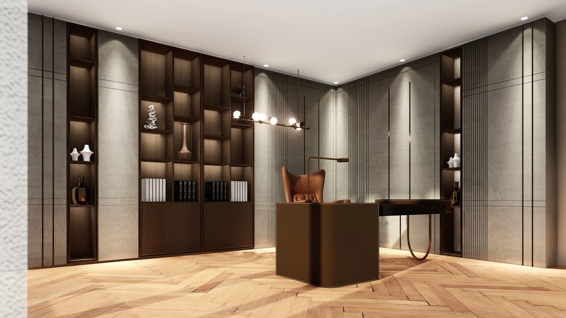 Dans ce bureau d'avocat, chaque détail a été minutieusement pensé pour incarner l'autorité et l'élégance. En entrant, on est immédiatement frappé par l'atmosphère solennelle qui émane de cet espace. Les murs, ornés de panneaux en bois sombre et de textures subtiles, créent un cadre raffiné et chaleureux. Le parquet en chevron, d'une teinte miel, ajoute une touche de noblesse et de tradition, contrastant magnifiquement avec les lignes modernes et épurées du mobilier. Au centre, un bureau imposant et parfaitement proportionné, flanqué d'un fauteuil ergonomique en cuir marron, invite à la concentration et à la réflexion. Les étagères, intégrées dans les murs, exposent discrètement des objets d'art et des livres de droit, témoignant du prestige et du savoir-faire. Les luminaires suspendus diffusent une lumière douce et apaisante, favorisant un environnement propice au travail intellectuel. Ce bureau d'avocat est un véritable sanctuaire où le design sophistiqué et la fonctionnalité se rencontrent pour créer un espace de travail inspirant et efficace.