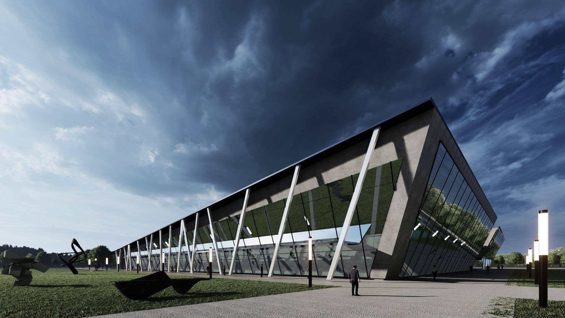 e musée, aux formes géométriques et épurées, se distingue par une structure angulaire et élancée, composée de larges vitres et de poutres blanches inclinées, créant une sensation de légèreté et de transparence. La couleur dominante est le gris béton, contrastant élégamment avec le vert de la pelouse environnante et le bleu profond du ciel. L'ensemble évoque une modernité sereine et sophistiquée. La façade vitrée permet une abondance de lumière naturelle, favorisant une atmosphère ouverte et accueillante, tout en renforçant le lien entre l'intérieur et l'extérieur. Psychologiquement, cette architecture inspire un sentiment de calme et de contemplation, stimulant la créativité et l'appréciation artistique chez les visiteurs. La disposition des sculptures extérieures, en harmonie avec l'édifice, ajoute une dimension supplémentaire d'interaction artistique, invitant à la réflexion et à l'exploration.