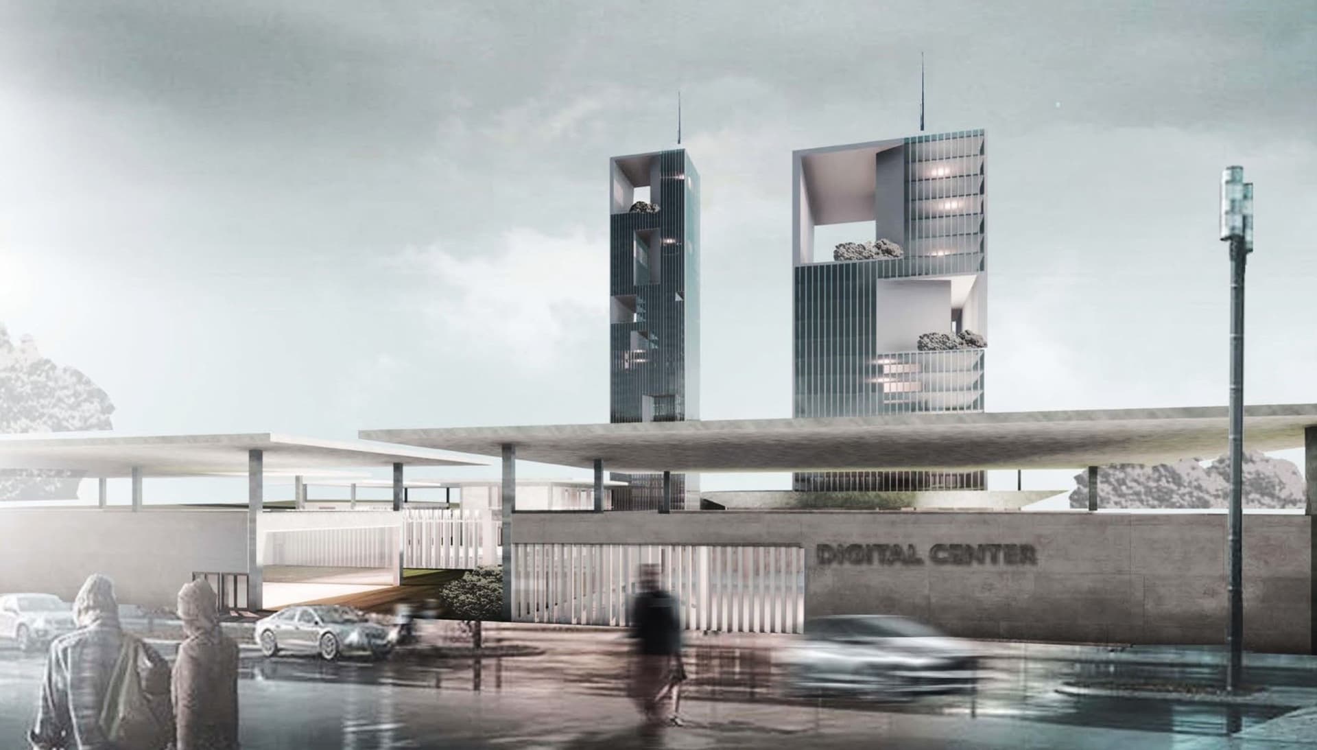 Ce projet vise à concevoir une zone tertiaire pour environ 5000 personnes dans le quartier administratif de l’Agdal, à côté de la gare LGV. Le terrain, d’une surface totale de 10 ha et de forme irrégulière, est bordé par les chemins de fer à l’ouest et par l’avenue de la gare à l’est. Un des principaux défis était de transformer cette irrégularité en une zone ordonnée et bien structurée. En respectant la topographie naturelle et en simplifiant les matériaux de construction et de finition, le design cherche à harmoniser l’espace. Une esplanade suit les courbes de niveau pour gérer les accès, tandis que la partie en rez-de-chaussée sert de socle pour absorber la hauteur des deux tours. Ces dernières, bien que différentes en taille, créent un contraste visuel intéressant et renforcent l’identité du projet par un effet de « grand maigre et petit obèse ».