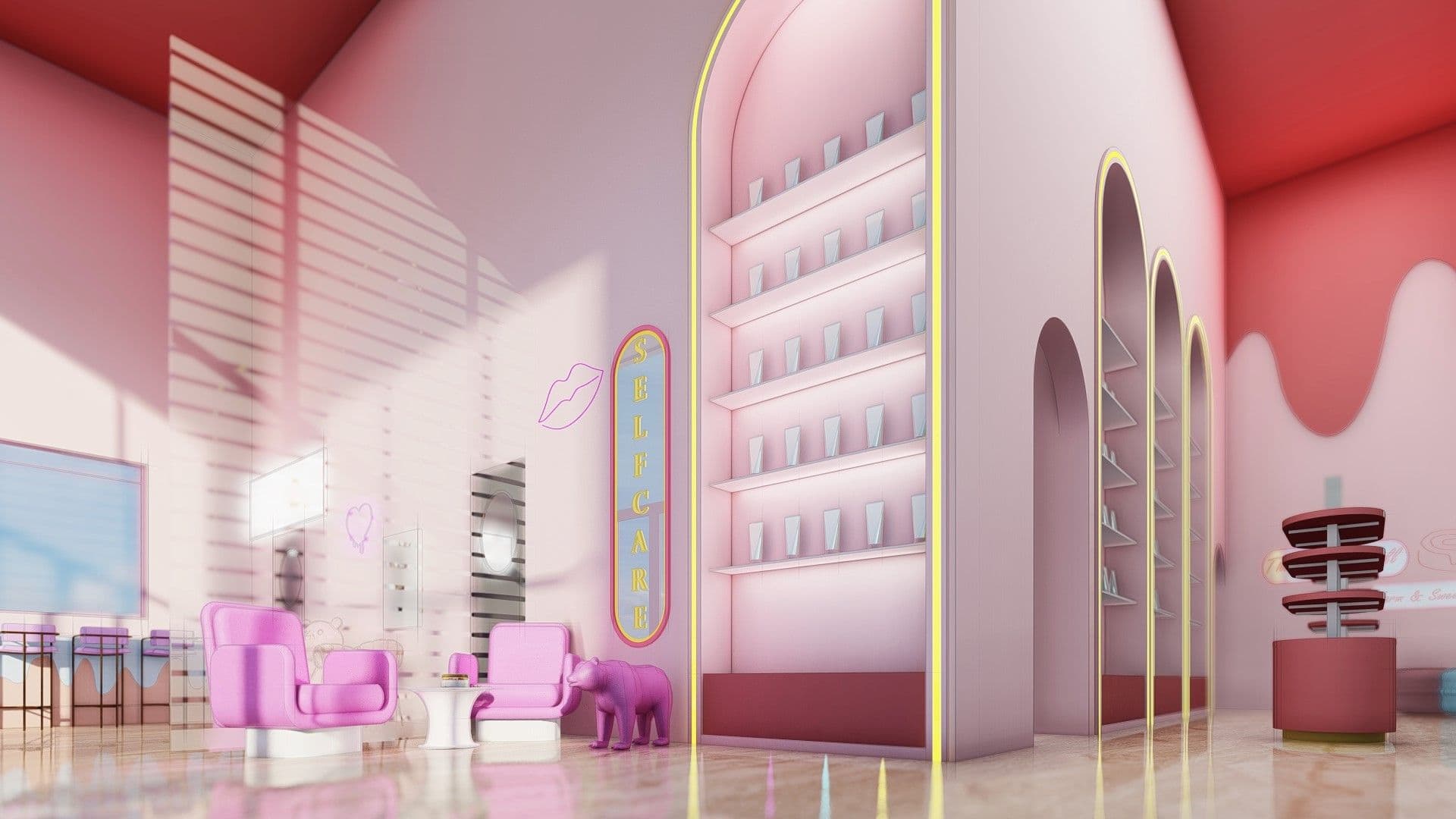 Dès que l'on franchit les portes de cette boutique de glaces et café, on est immédiatement enveloppé par une ambiance douce et ludique, où le rose pastel règne en maître. Les formes arrondies et les arches élégantes des étagères rappellent les vagues délicates de la crème glacée, tandis que les néons en forme de lèvres ajoutent une touche de glamour espiègle. Les fauteuils roses, confortables et accueillants, invitent à la détente, tandis que le petit éléphant violet apporte une note d'émerveillement et de fantaisie. Les murs dégradés, du rose au rouge, créent une atmosphère chaleureuse et réconfortante, idéale pour savourer une glace ou un café en bonne compagnie. Les étagères, soigneusement éclairées, mettent en valeur les produits avec une finesse presque artistique, tandis que la lumière naturelle filtre à travers les stores, ajoutant une douce clarté à l'ensemble. C'est un espace où le design joue avec la forme et la couleur pour créer une expérience sensorielle unique, transformant chaque visite en un moment de pur plaisir et de créativité.