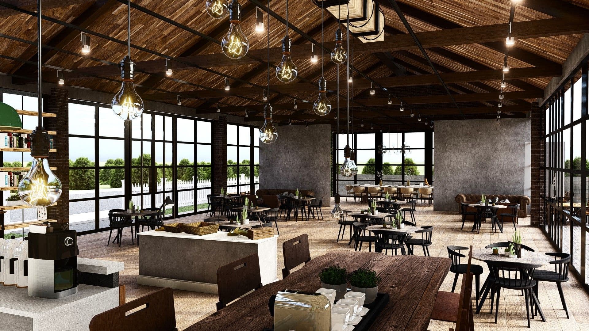 En pénétrant dans ce bar-restaurant industriel, on est immédiatement transporté dans un espace où le charme brut rencontre l'élégance contemporaine. Les vastes fenêtres en acier noir, du sol au plafond, laissent entrer une lumière naturelle abondante qui se répand sur le plancher en bois massif, accentuant la chaleur de cet espace convivial. Les murs en briques apparentes et les structures métalliques se marient harmonieusement avec le plafond en bois aux poutres apparentes, créant une ambiance à la fois robuste et accueillante. Les luminaires suspendus, avec leurs ampoules à filament, diffusent une lumière douce et vintage, ajoutant une touche de nostalgie industrielle. Les meubles en bois sombre et les fauteuils en cuir marron procurent un confort raffiné, invitant à la détente et à la conversation. Cet environnement, où chaque détail est soigneusement pensé, offre un cadre propice à la créativité et à la convivialité, un lieu où l'on se sent à la fois inspiré et à l'aise.