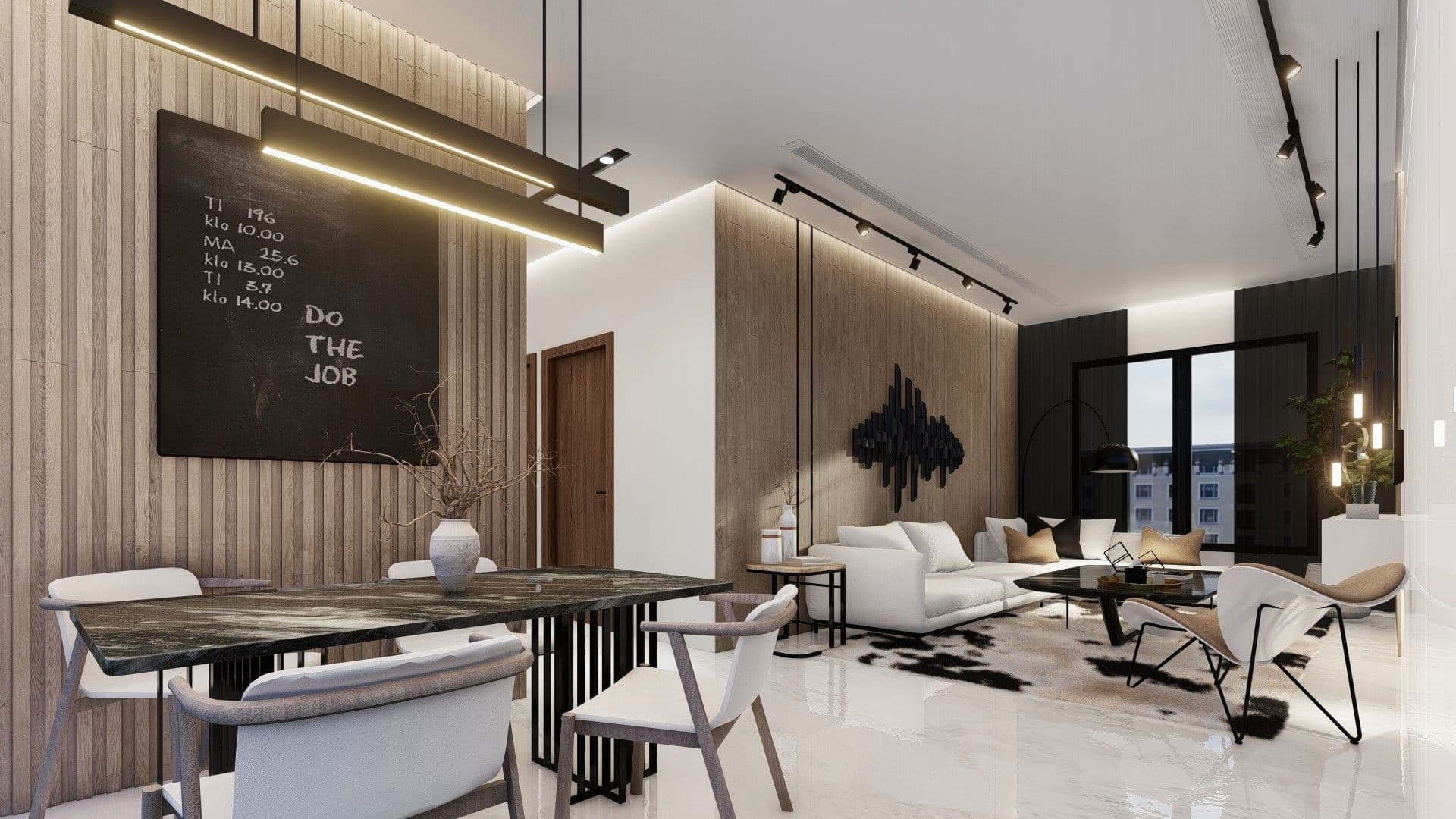 un intérieur moderne et épuré, combinant des éléments naturels et des finitions contemporaines. Les murs en bois texturé ajoutent une chaleur naturelle, contrastée par des meubles minimalistes et des accents métalliques noirs. L'éclairage indirect et les luminaires design créent une ambiance cosy et raffinée. Le salon, avec ses canapés blancs et son art mural sculptural, respire l'élégance discrète. Une chambre, dominée par des tons neutres et des textures douces, invite à la détente avec son éclairage doux et son agencement harmonieux.